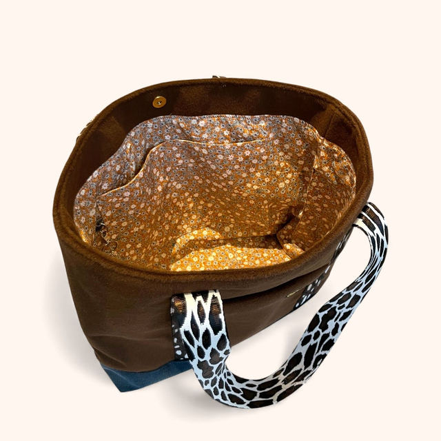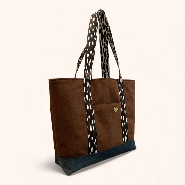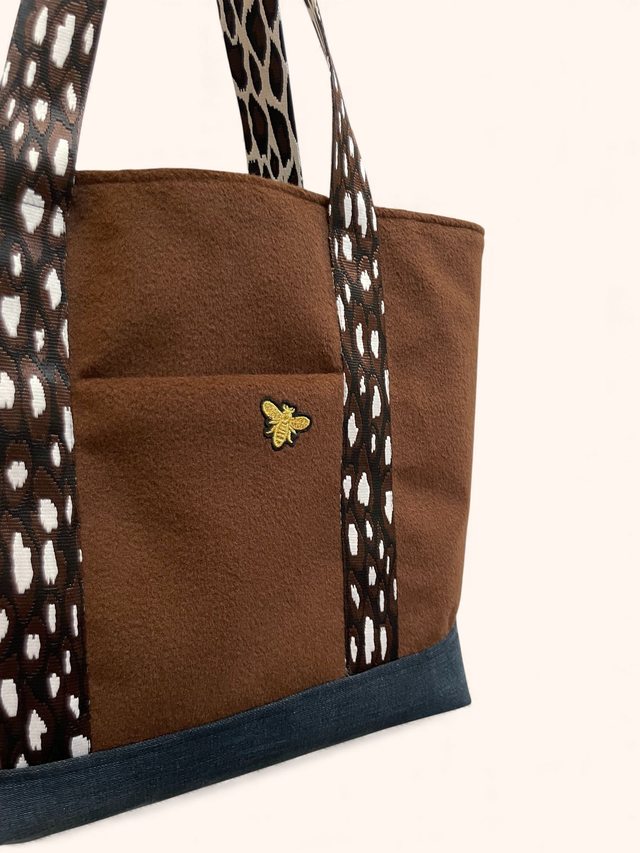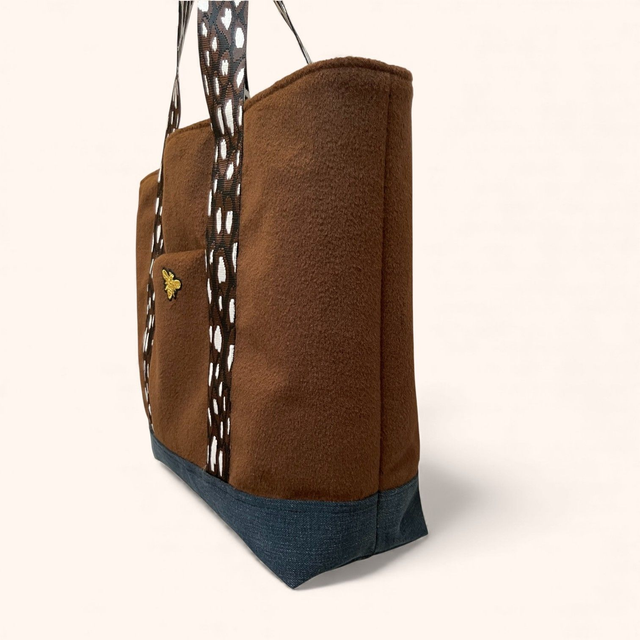 Cabas doux et chaleureux réalisé dans un tissu lainé de qualité, doublé d’une base en jean pour une meilleure structure.