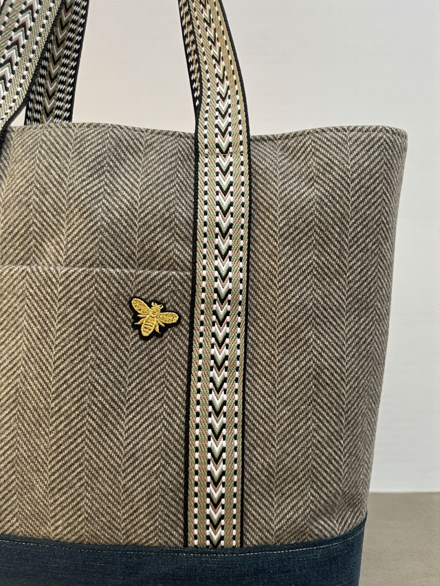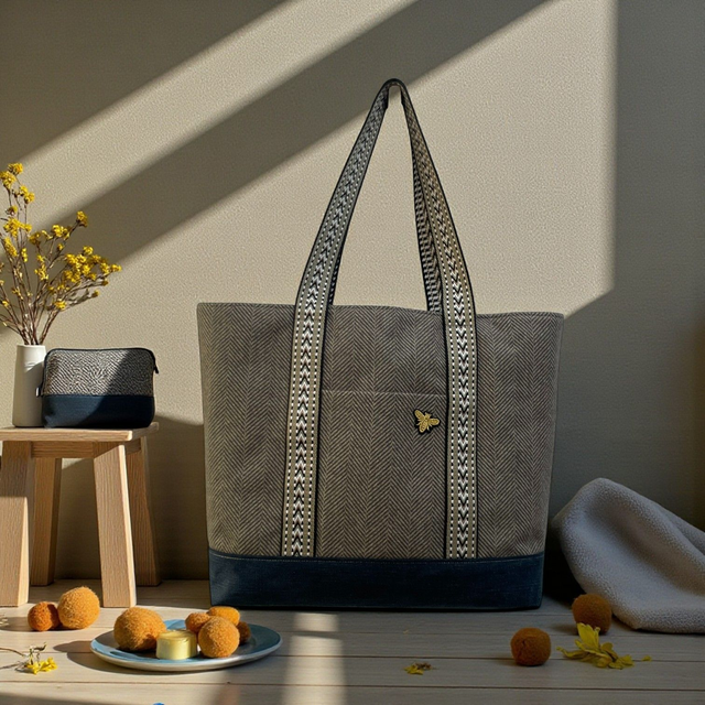 Entièrement cousu à la main dans mon atelier, ce cabas en lainage chevron vert allie couleur intense et solidité.